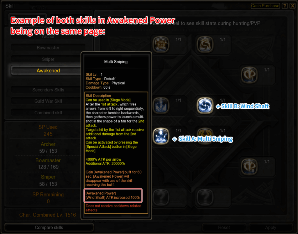Awakened Power is a skill enhancement process available to every class in Awakening. Like Instant, it’s a process where using skill A enhances skill B, but the enhancement is purely damage. Skill A of Awakened Power is usually the bottom left skill of the inner ring, while skill B can be another skill on the Awakened page, or the 2nd specialization page.