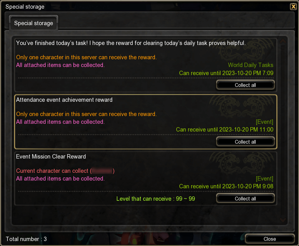 The Special Storage is where login, daily and weekly task rewards will be sent to. Tasks can be completed by any character on your account, and any character can collect task rewards from Special Item Storage. Sometimes character-specific event/mission box rewards are also sent here instead of the mailbox.
