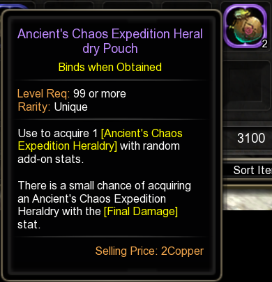 Ancient’s Chaos Heraldries are found in pouches that only drop from the Ark Crash Site dungeons, and as rewards for Daily Quests from Heraldry Scholar Lupinus and Blacksmith Molin in Milla Laurel. They feature 4-5 lines of better stats boost than Hero’s Chaos (except STR/AGI/INT/VIT which are not included) including an elusive 1000 Final Damage, but also with the equal possibility to get negative values.