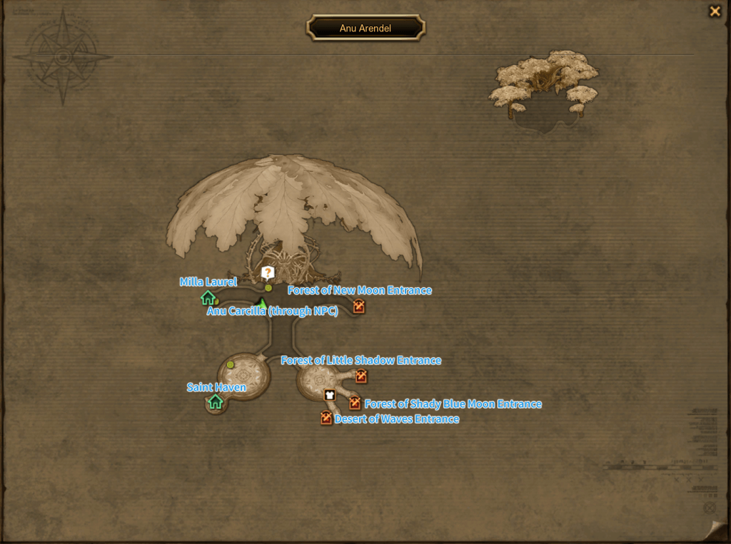 Links to Milla Laurel (west) and Saint Haven (south west.) Speak to Elf Guard Patita to go to Anu Arendel (only when not in party or party has 1 member).